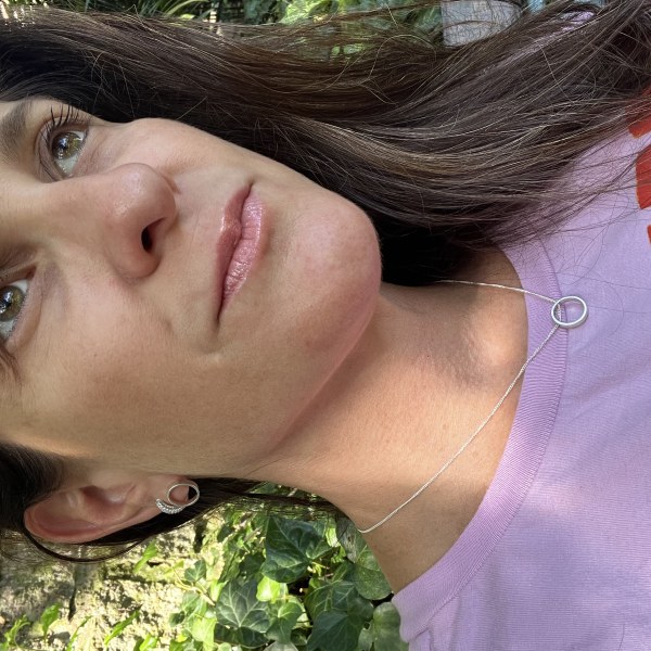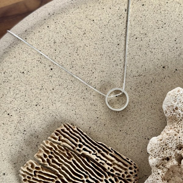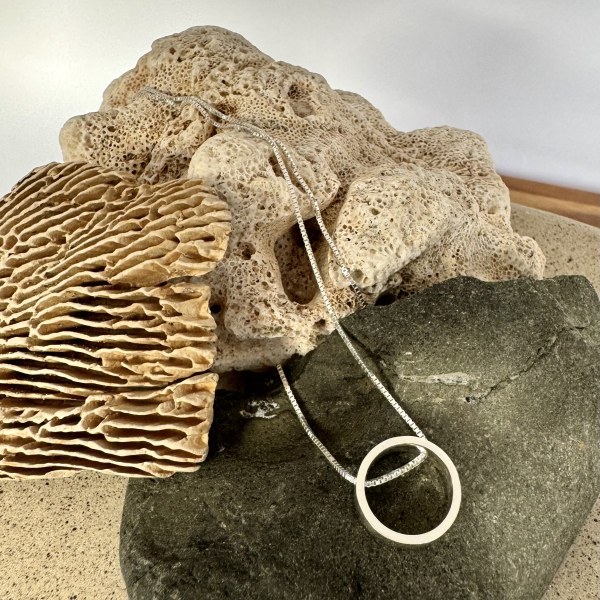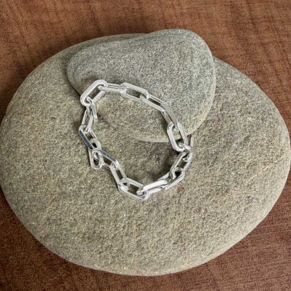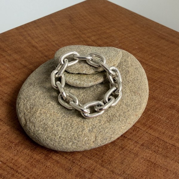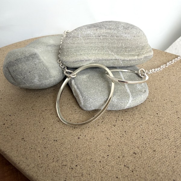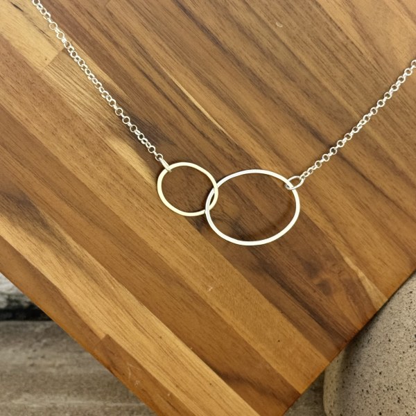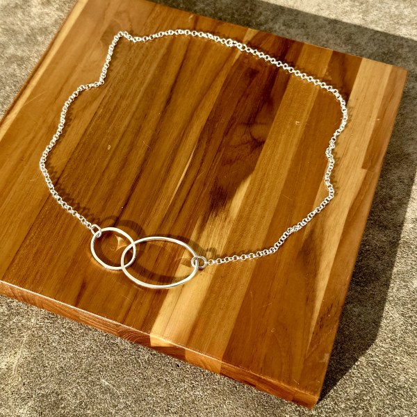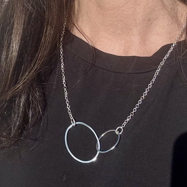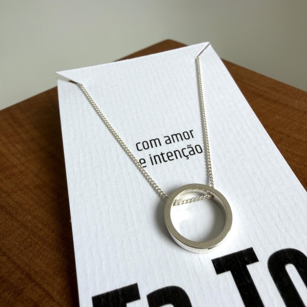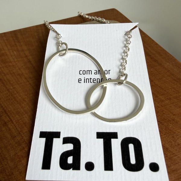 Colar em prata 950 com 2 elos de formato orgânico entrelaçados e corrente em elo português com aproximadamente de 50cm de comprimento.